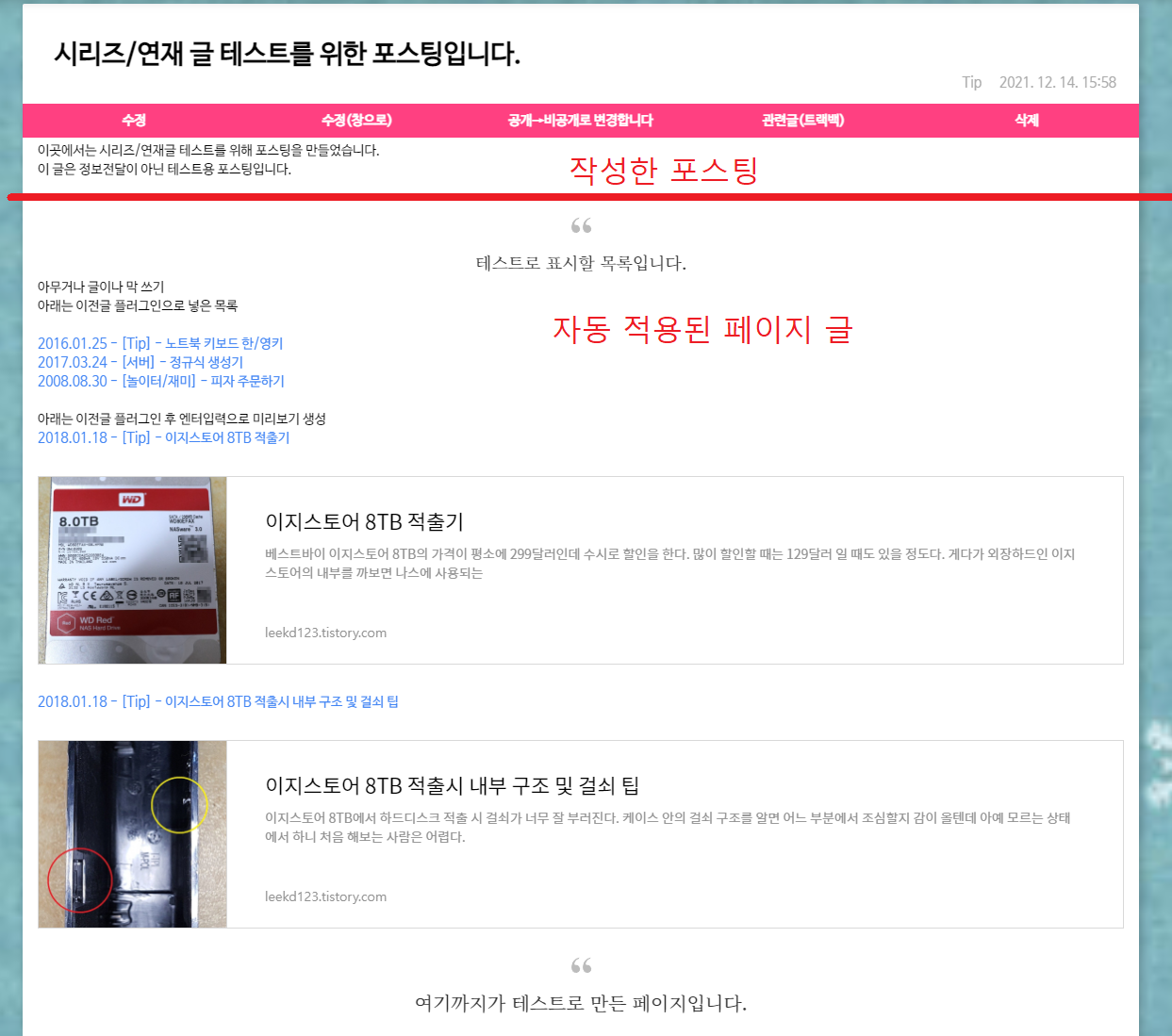 글을 발행한 후 조회해 보면 아래와 같이 페이지의 내용이 자동으로 적용된 모습을 확인할 수 있다.