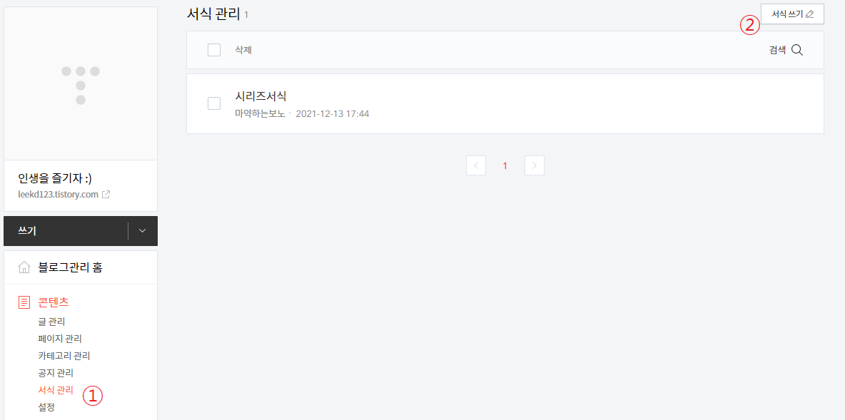 먼저 관리자 페이지에서 서식 관리로 이동하여 서식을 하나 생성한다. 여기서는 "시리즈서식"이라고 이름을 붙였다.