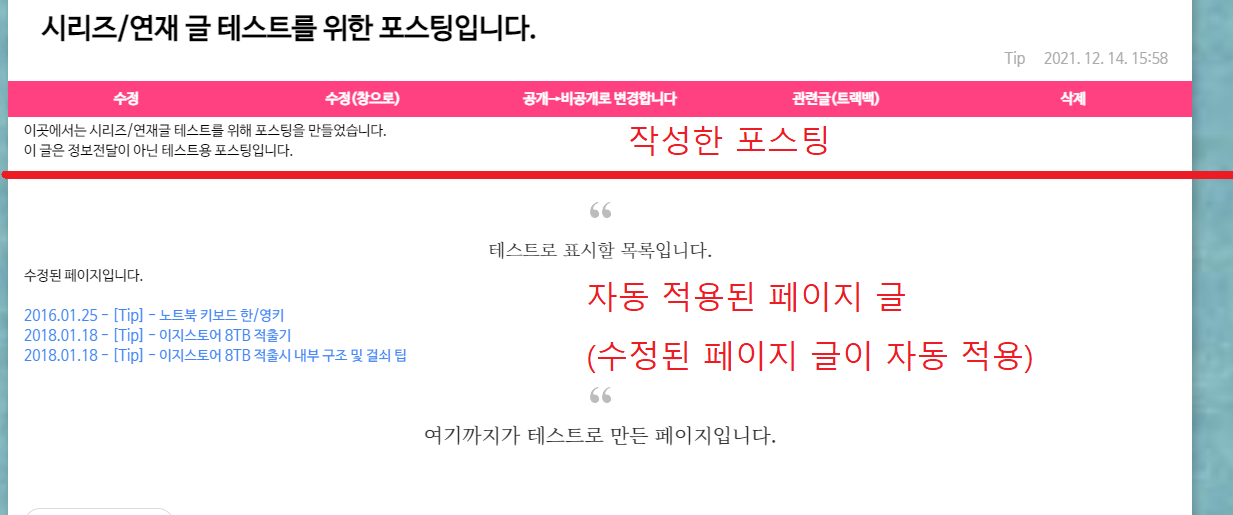 포스팅을 새로고침하여 다시 조회해보면 아래와 같이 수정된 페이지의 내용이 자동으로 적용된 모습을 확인할 수 있다. [아래 링크 확인]