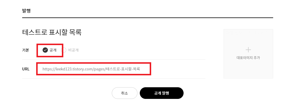 반드시 공개로 발행해야 하며 생성되는 페이지의 URL을 적당히 수정한다. URL은 그대로 두어도 상관없고 한/영 상관없이 동작한다.