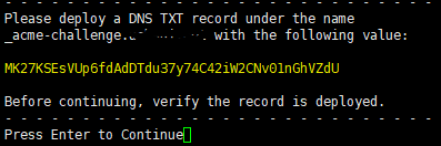 화면에서 표시된 _acme-challenge.domain.com 레코드를 dns 서버에서 TXT 레코드로 등록한다.