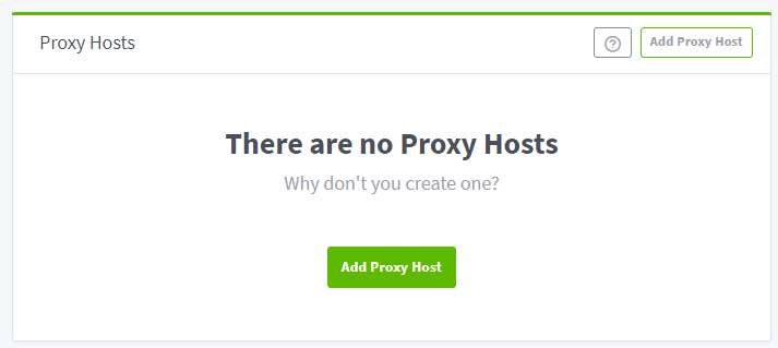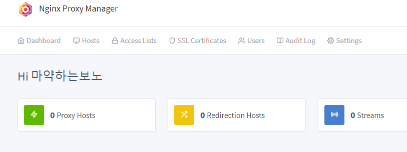 Dashboard 에서 Proxy Hosts를 누르거나 Hosts 메뉴에서 Proxy Hosts를 누르면 아래와 같이 프록시를 설정할 수 있는 화면이 나온다.